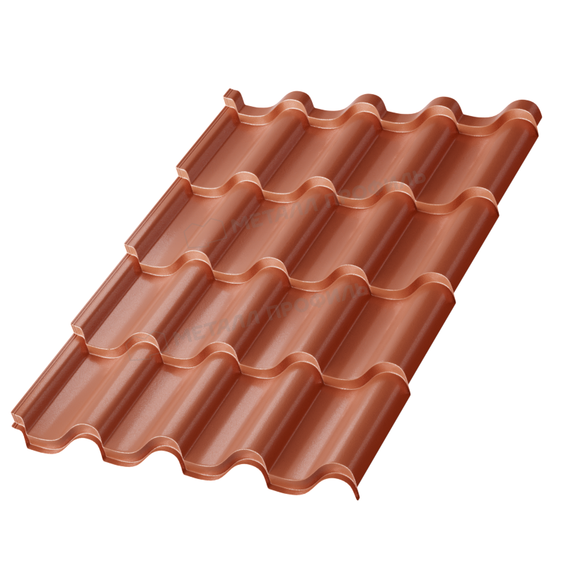 Профиль Монтерроса-ML характеризуется симметричными волнами высотой 24 мм и шагом 350 мм, что создает эффект натуральной керамической черепицы. Толщина стали 0,5 мм обеспечивает оптимальный баланс между весом и прочностью, делая материал легким в монтаже, но устойчивым к деформациям. Этот профиль подходит для скатных крыш с углом наклона от 12 градусов, обеспечивая отличную гидроизоляцию и вентиляцию.